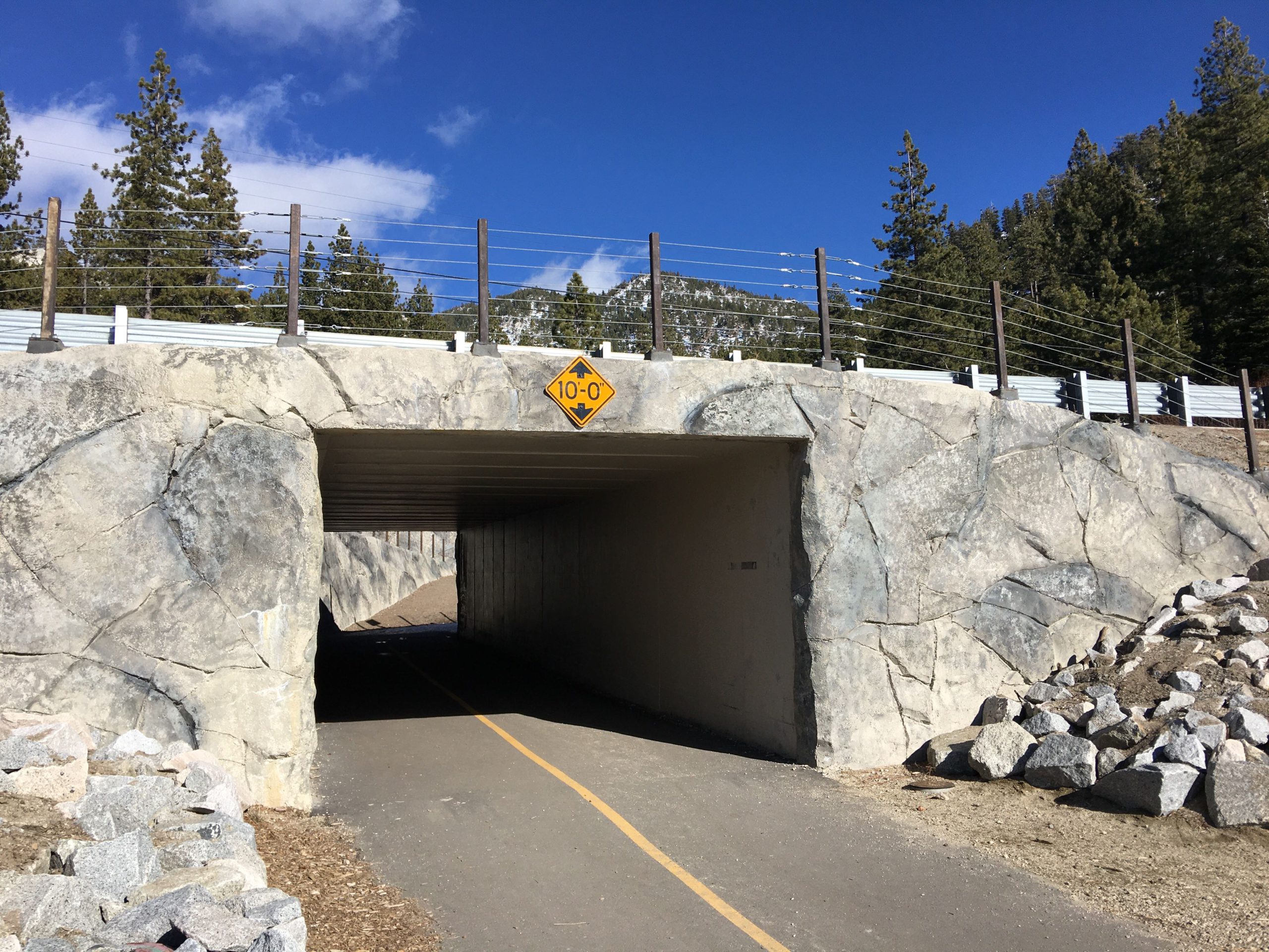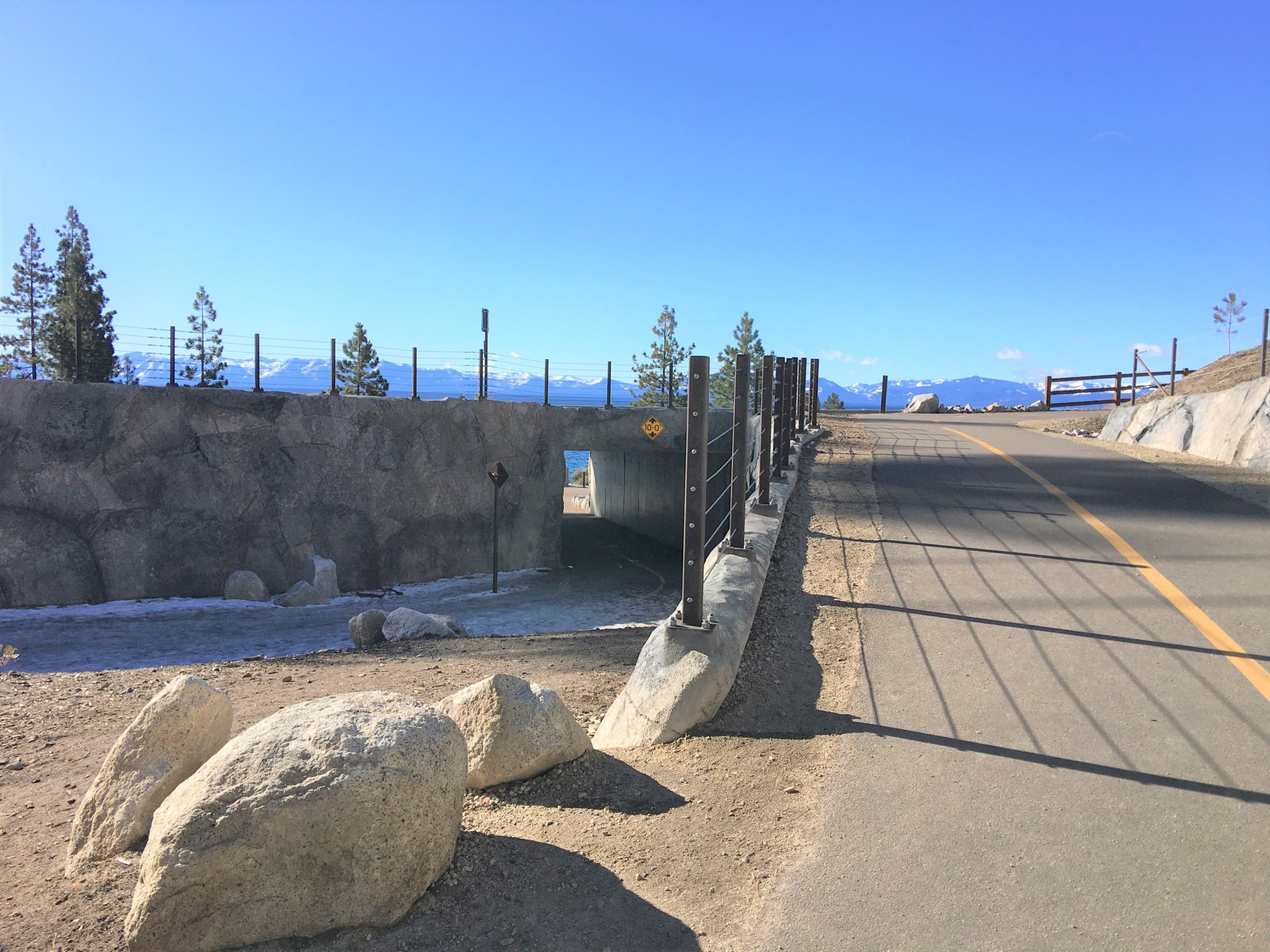 山側から湖畔沿いへは州道28号線の下のトンネルをくぐるので車道を渡らなくてすみ安全です。このトレイルの長所のひとつでもあり、費用もかかったポイントです。