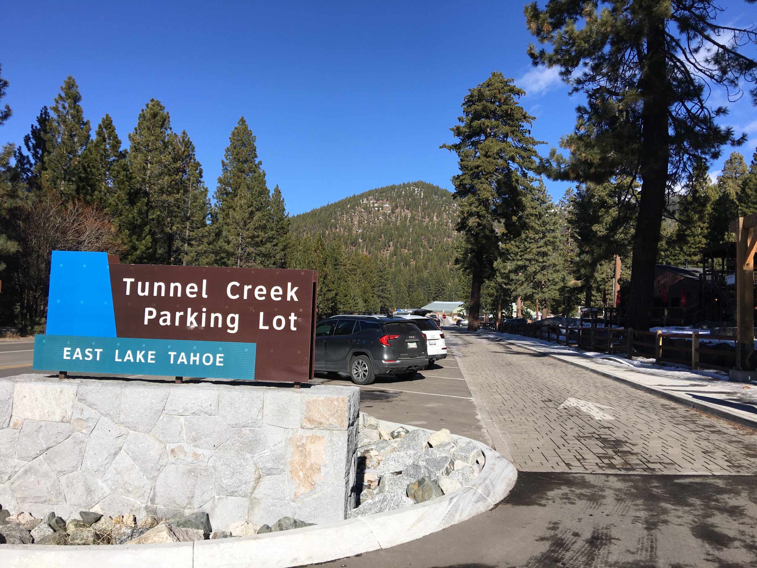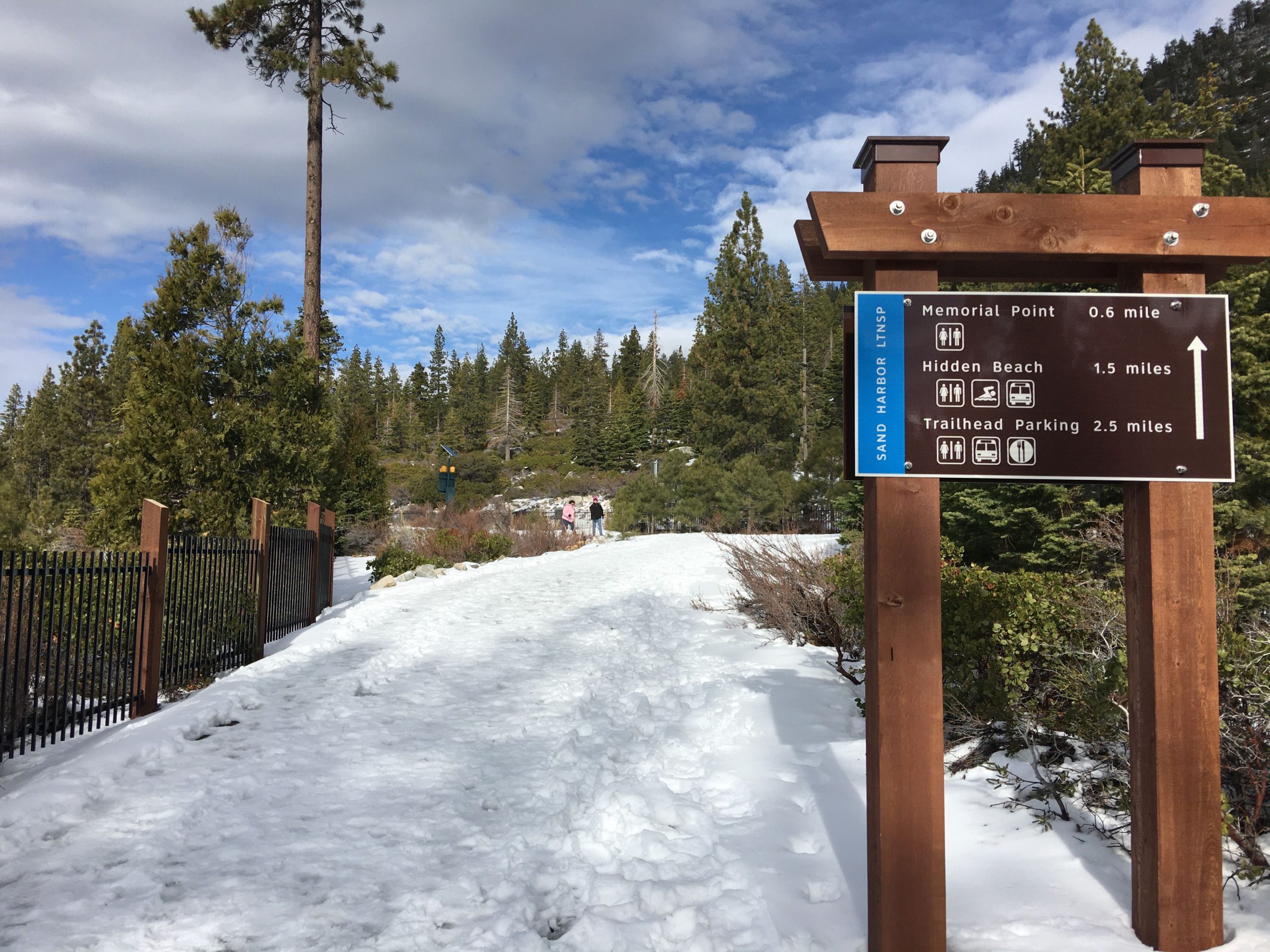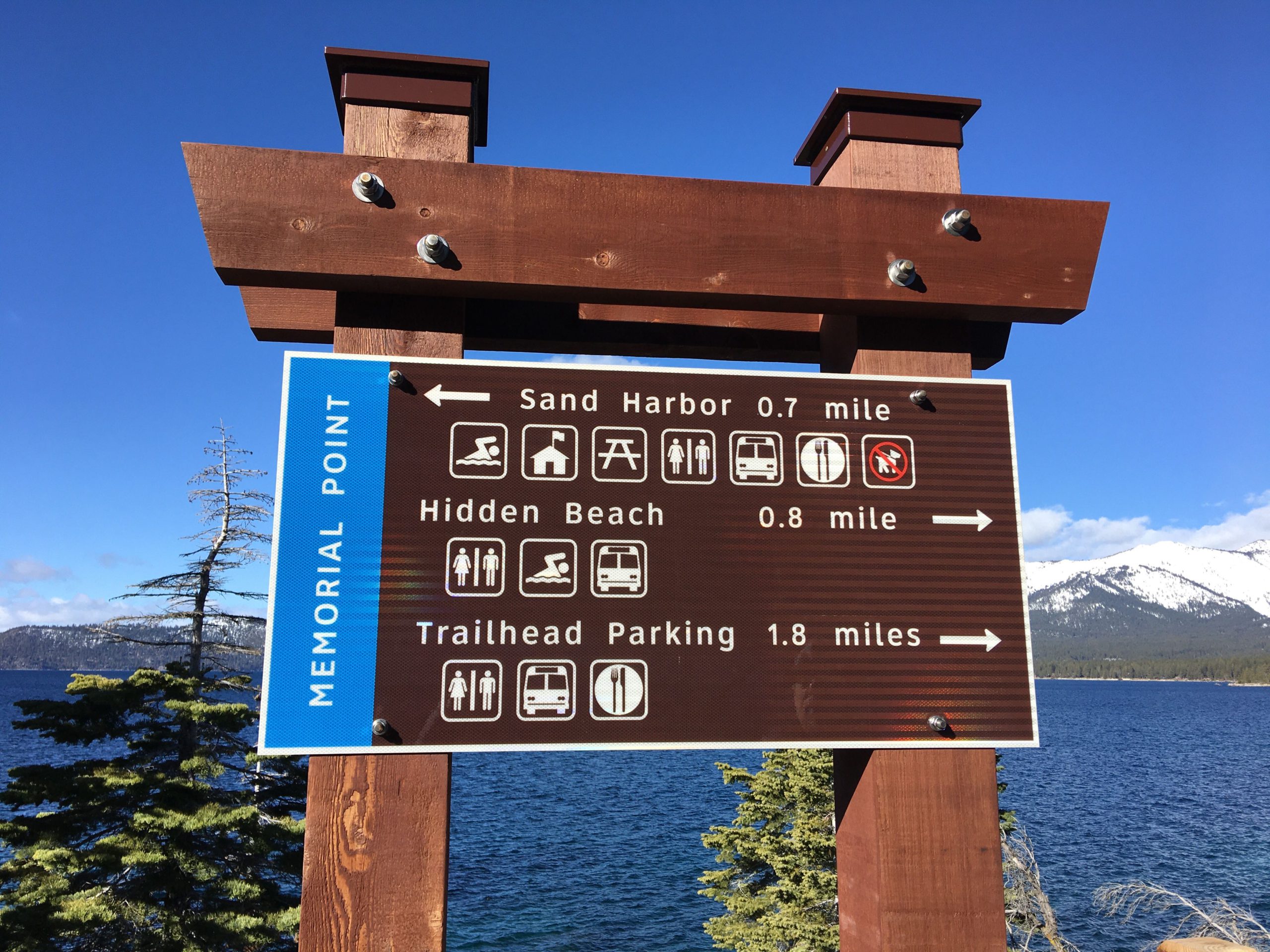 さて、タホ湖で遊ぶのに最も気になる駐車場ですが、トレイルの北側スタート地点に91台分完備されてます。SR28(州道28号線)をIncline Villageから南東方面へ下り街が終わるちょい手前左のPonderosa Ranch Roadと交差するSR28の東側側道に駐車場があります。タホ湖周辺の駐車場は激戦区で特に週末は朝早く来ないと!とよく言われますが、日曜とはいえ冬だからか午前10時半に着いて半分程しか埋まっておらず楽勝でした。尚、Sand Harborからスタートする場合は州立公園入園料$10支払いの上州立公園の駐車場を利用できます。公園は開園時間が限られてますのでこちらで確認を。