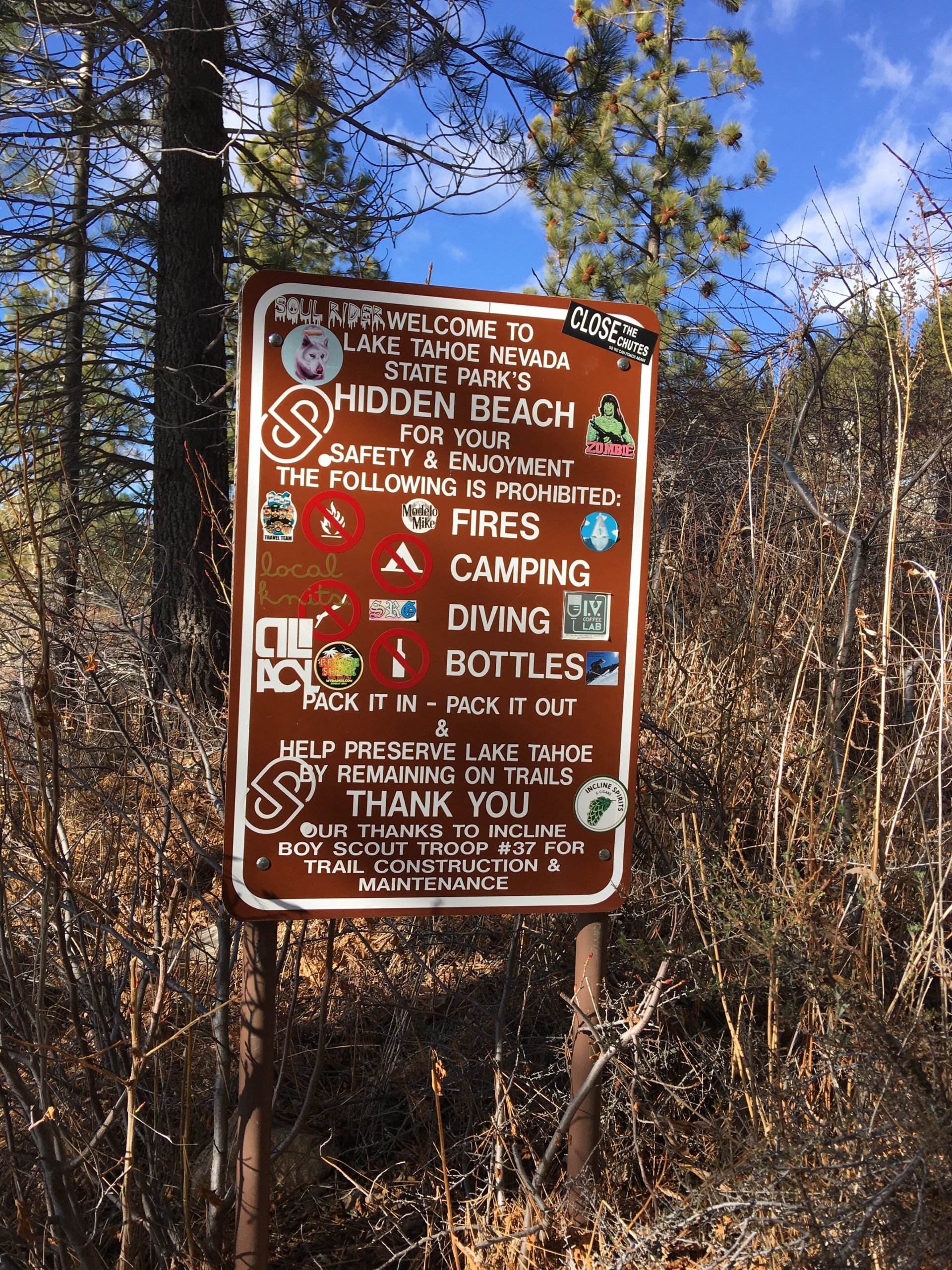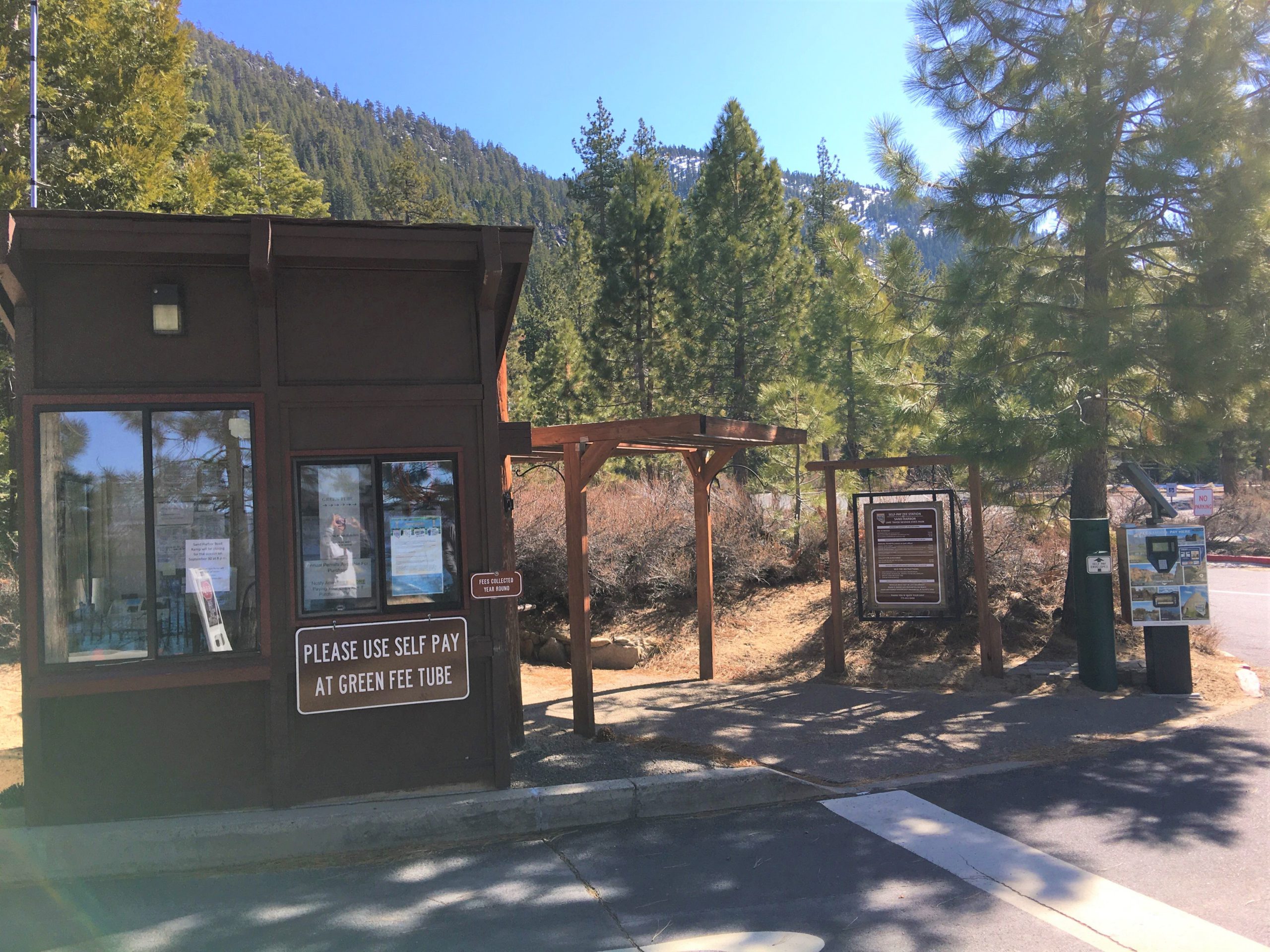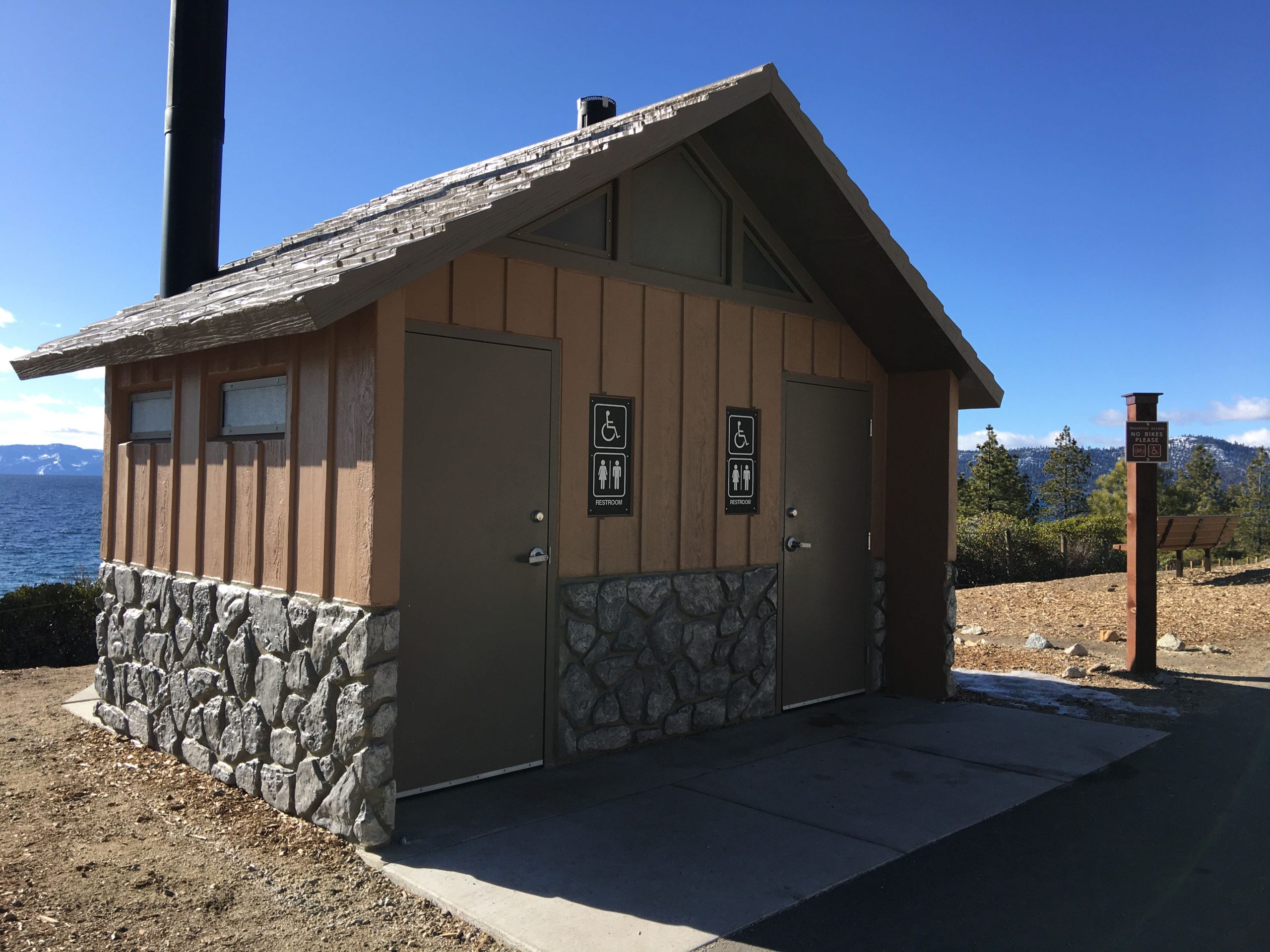 さて、タホ湖で遊ぶのに最も気になる駐車場ですが、トレイルの北側スタート地点に91台分完備されてます。SR28(州道28号線)をIncline Villageから南東方面へ下り街が終わるちょい手前左のPonderosa Ranch Roadと交差するSR28の東側側道に駐車場があります。タホ湖周辺の駐車場は激戦区で特に週末は朝早く来ないと!とよく言われますが、日曜とはいえ冬だからか午前10時半に着いて半分程しか埋まっておらず楽勝でした。尚、Sand Harborからスタートする場合は州立公園入園料$10支払いの上州立公園の駐車場を利用できます。公園は開園時間が限られてますのでこちらで確認を。